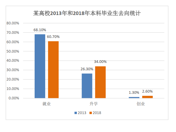 As is numerically illustrated in the statistics (about graduates' choice), the percentage of those who go to work (after graduation) decreased from 68% to 61% in the five years between 2013 and 2018.While the percentage of those who pursue a higher degree increased from 26% to 34%.In my perspective, the above figures reveal a currently prevailing tendency among contemporary society.